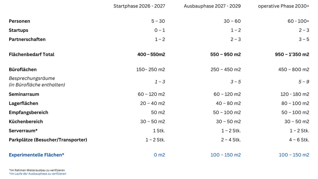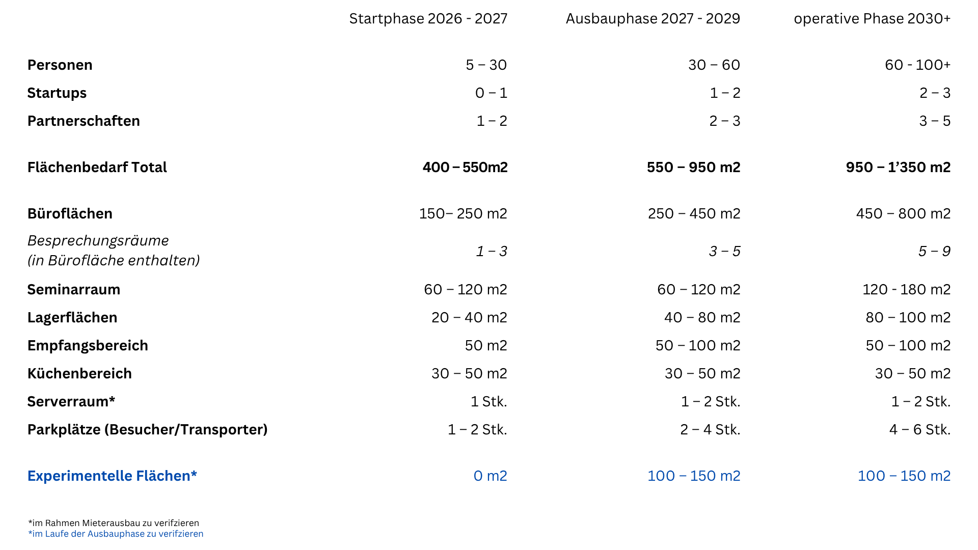 Der Flächenbedarf basiert auf der konkretisierten Aufbau- und Entwicklungsplanung der ETH Zürich. Die Umsetzung erfolgt in mehreren Phasen. In der Startphase (2026-2027) ist ein rasch realisierbarer und gut zugänglicher Standort auch als provisorischer Betrieb denkbar. In der Phase des Aufbaus (2027-2029) wird zusätzlicher Flächenbedarf hinzukommen, der idealerweise am gleichen Standort zur Verfügung gestellt werden kann. Ein neuer Standort als langfristige Lösung ist dabei nicht ausgeschlossen, um die Bedürfnisse der operativen Phase (ab 2030) abzudecken.