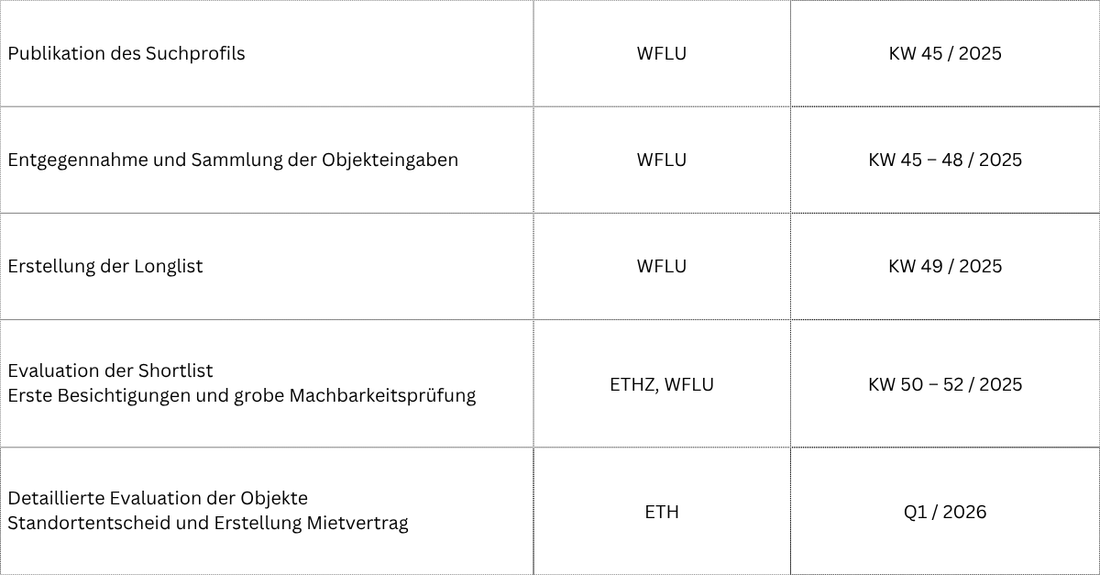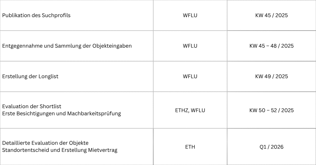 Interessierte Immobilieneigentümerinnen und -eigentümer sind eingeladen, konkrete Objektvorschläge einzureichen. Die ETH Zürich plant, die benötigten Flächen anzumieten. Der Bezug der Fläche für die Startphase wird im Verlauf des Jahres 2026 angestrebt.