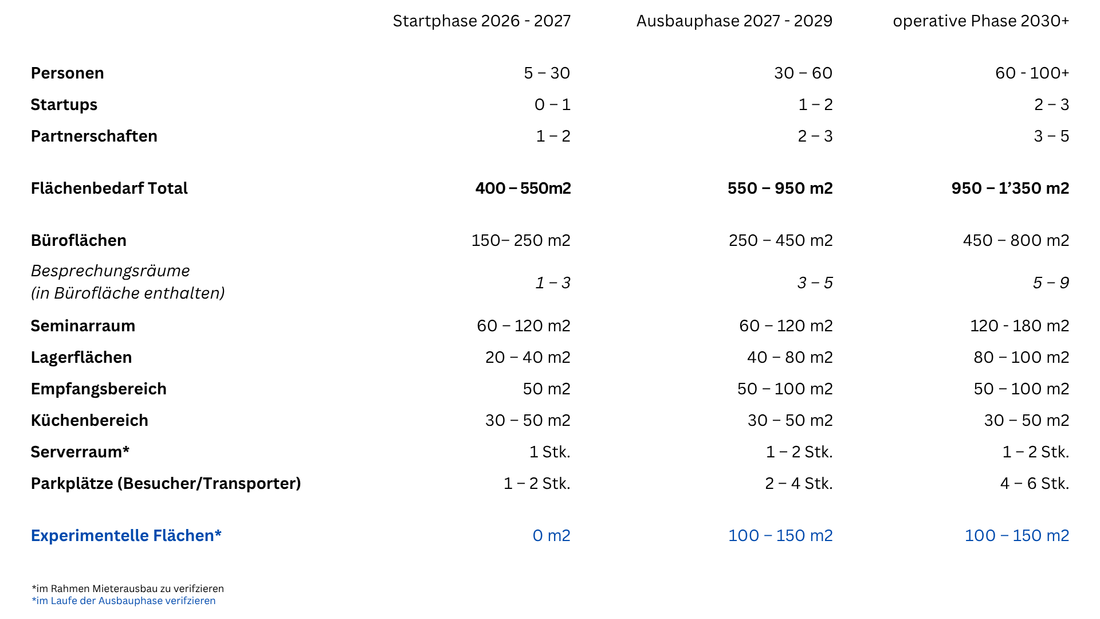 Der Flächenbedarf basiert auf der konkretisierten Aufbau- und Entwicklungsplanung der ETH Zürich, und die Umsetzung erfolgt in mehreren Phasen. In der Startphase (2026-2027) ist ein rasch realisierbarer und gut zugänglicher Standort, auch als provisorischer Betrieb denkbar. In der Phase des Aufbaus (2027-2029) wird zusätzlicher Flächenbedarf hinzukommen, der idealerweise am gleichen Standort zur Verfügung gestellt werden kann. Ein neuer Standort als langfristige Lösung ist dabei nicht ausgeschlossen um die Bedürfnisse der operativen Phase (ab 2030) abzudecken.