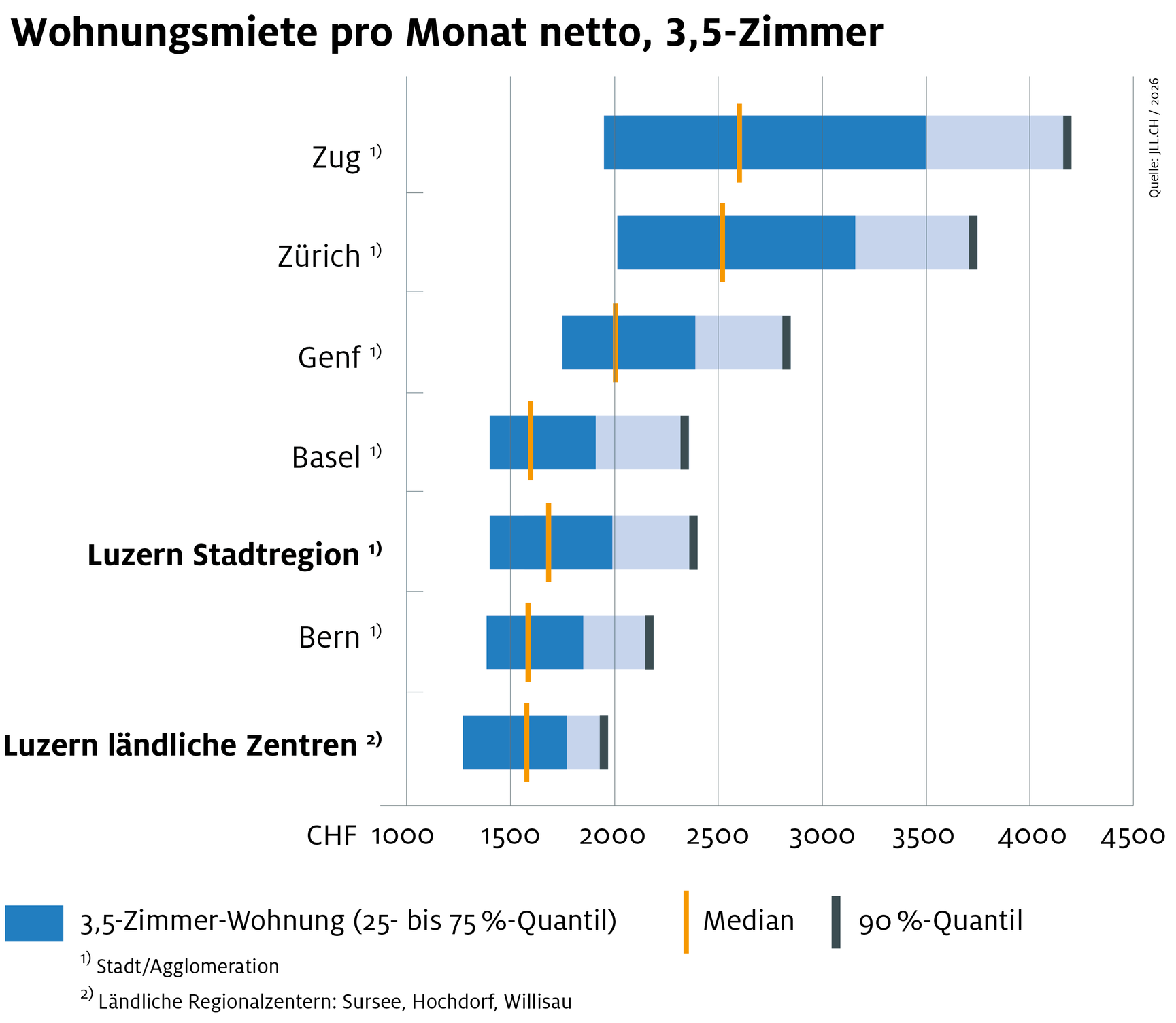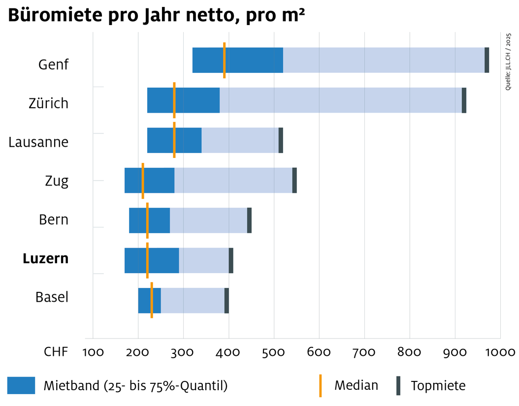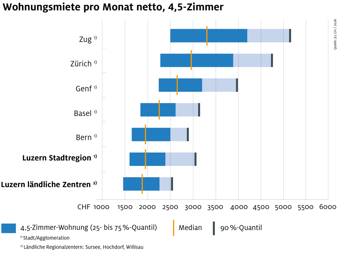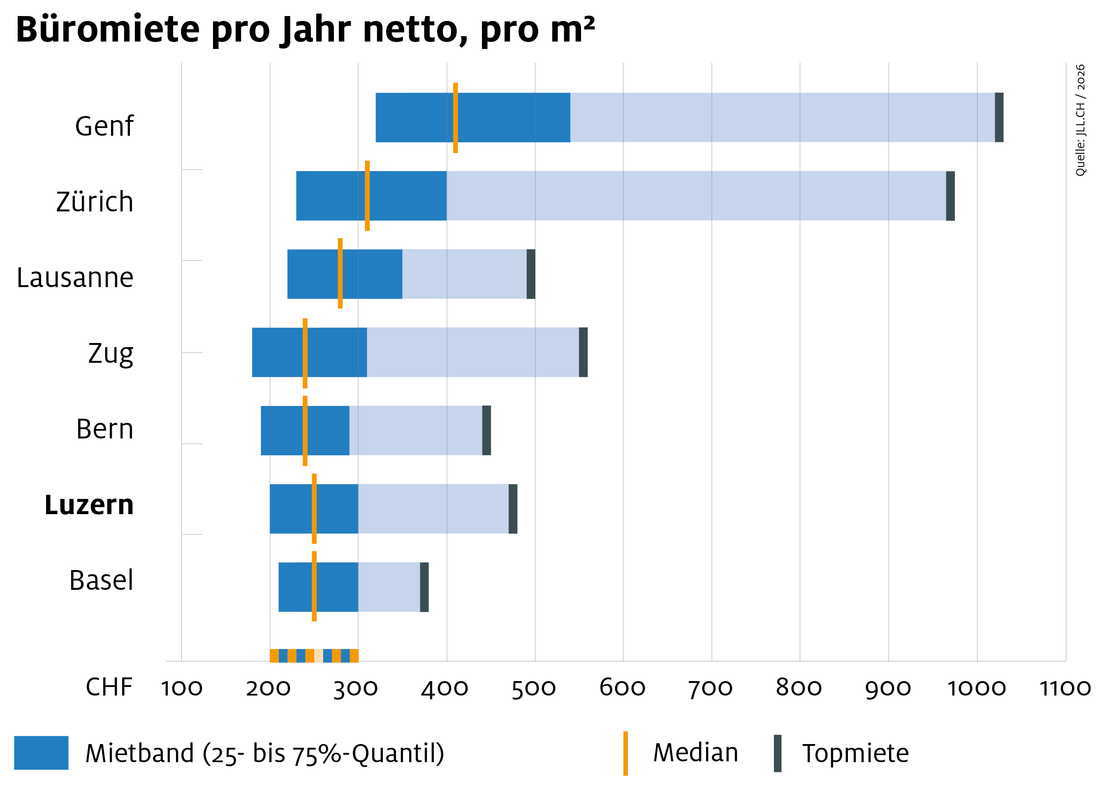 Die Mietpreise für Büroflächen im Kanton Luzern sind attraktiver als in Basel, Genf, Lausanne, Zürich oder Zug. Entlang der Hauptverkehrsachsen Luzern–Zug–Zürich sowie Luzern–Basel sind Grundstücke und Büroräumlichkeiten in allen Grössen und mit bester Verkehrsanbindung zu attraktiven Preisen verfügbar.