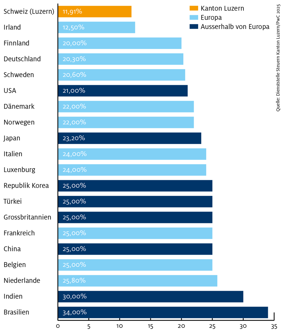 Der Kanton Luzern zählt zu den steuergünstigsten Unternehmensstandorten der Schweiz und überzeugt auch im internationalen Vergleich mit einer tiefen Steuerbelastung für Unternehmen.