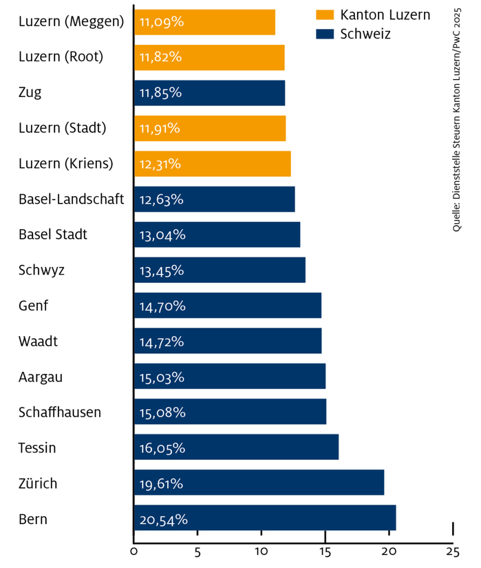 Die effektive Steuerbelastung für Unternehmensgewinne variiert im Kanton Luzern je nach Gemeinde. Meggen ist der steuergünstigste Standort.